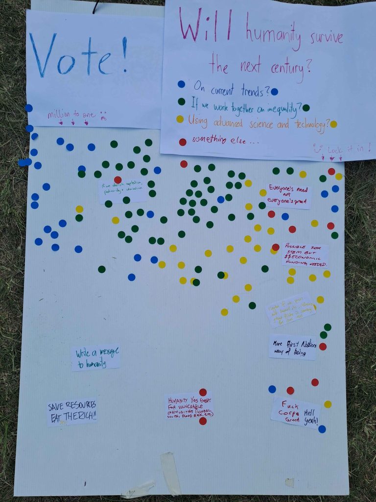 For Brisbane Pride 2024, I helped co-organise a stall with Fusion Party Australia. As part of the stall we had a dot vote tally running with the question: “Will humanity survive the next century?” Passers-by were invited to place one of four coloured stickers on the board, with each colour representing a different approach. Leftmost side of the board was labelled “million to one :(” and rightmost side of the board was labelled “Lock it in!”. The four colours/approaches were: Red (“On current trends”), Green (“If we work together on inequality”), Yellow (“Using advanced science and technology”), Red (“Something else…”).
