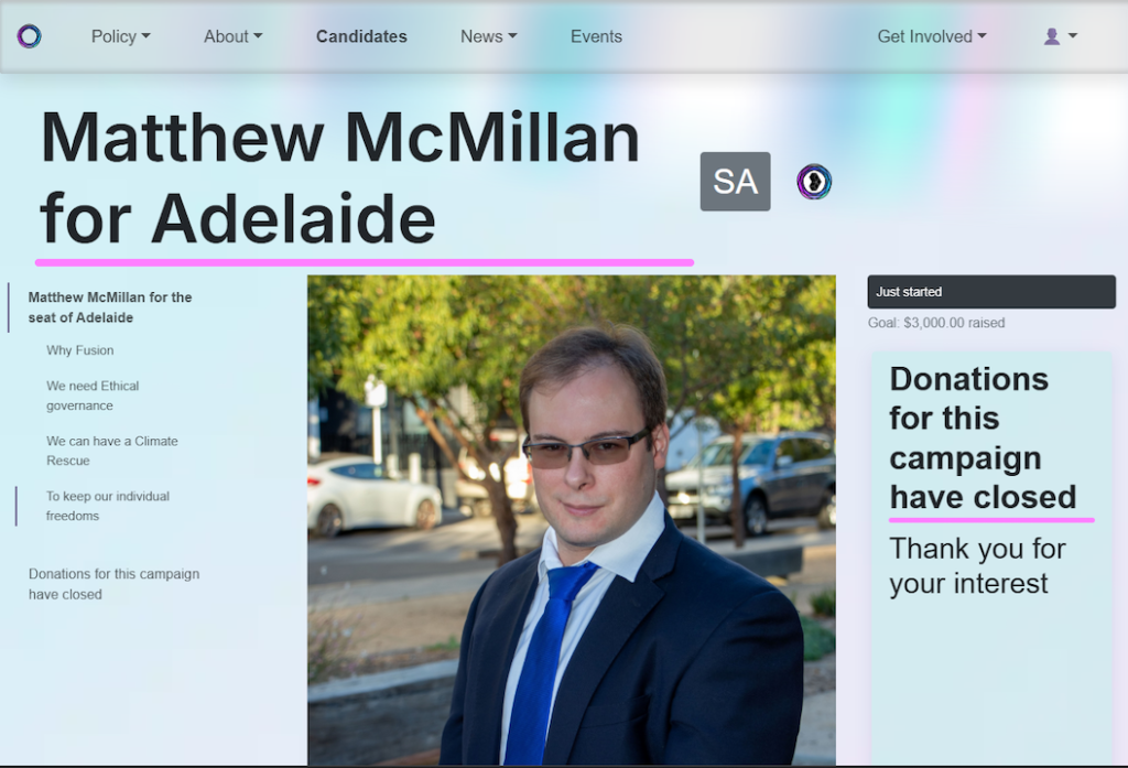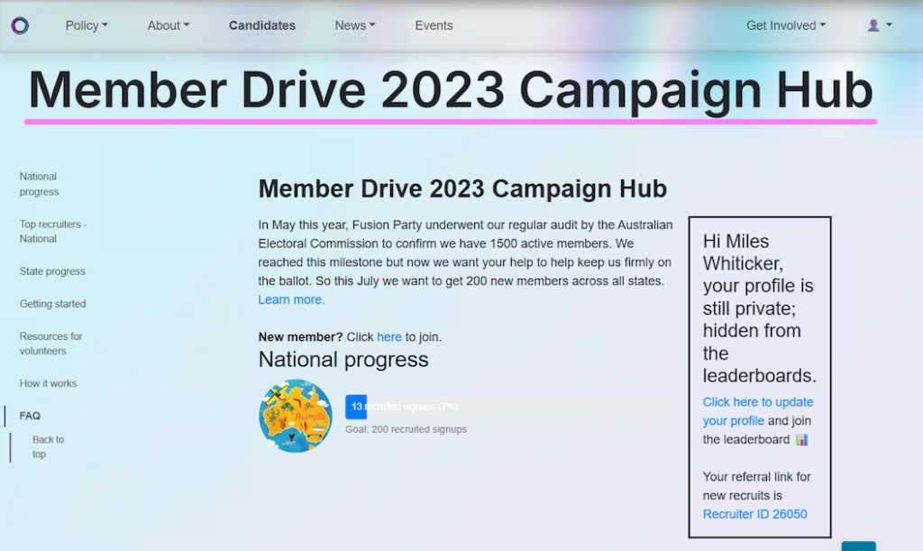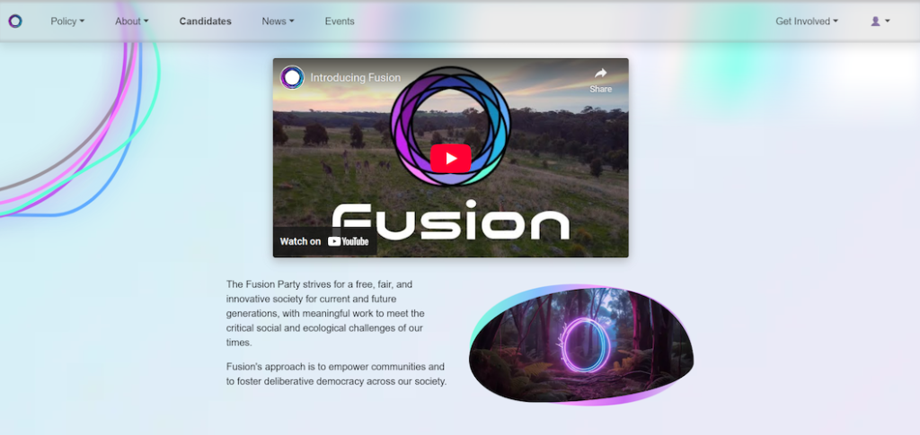 I provide support and maintenance for the website, as well as being solely responsible for the new candidate profile webpages and the 2023 member drive campaign hub. See the source code here https://github.com/Fusion-Party-Aus/colourful_fusion_theme and the website itself here https://www.fusionparty.org.au/